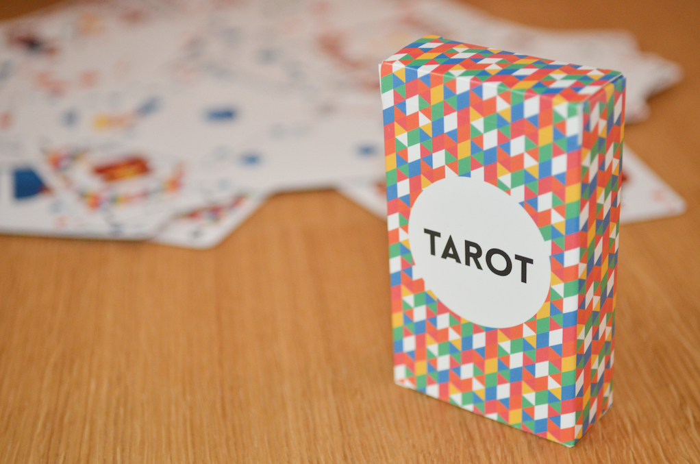 Construite géométriquement, chaque carte a été revisitée afin de créer une version moderne du jeu de tarot classique.